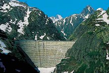 Die Stauanlage Grimsel besteht aus den Talsperren Spitalllamm und Seeuferegg, Stausee Gelmer und der Zentrale Handeck.