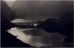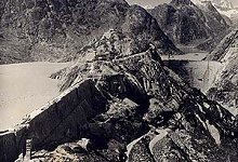 Seegrund des Grimselsees- die Überreste des alten Grimsel-Hospiz. Ein halbes Jahrtausend lang hatte es Wanderer, Pilger, Säumer und Saumtiere beherbergt; auf der Bernerseite, eine Wegstunde unterhalb der Passhöhe. 1929 wurde es geräumt und verschwand in den Fluten des Grimselstausees. Dafür erstellte die KWO auf dem Nollen ein neues Hospiz. Es fügt sich genau so gut in die Landschaft ein, wie das bald 50jährige Berghaus Oberaar. Es hatte seinerzeit als Ingenieurs-Unterkunft gedient.
